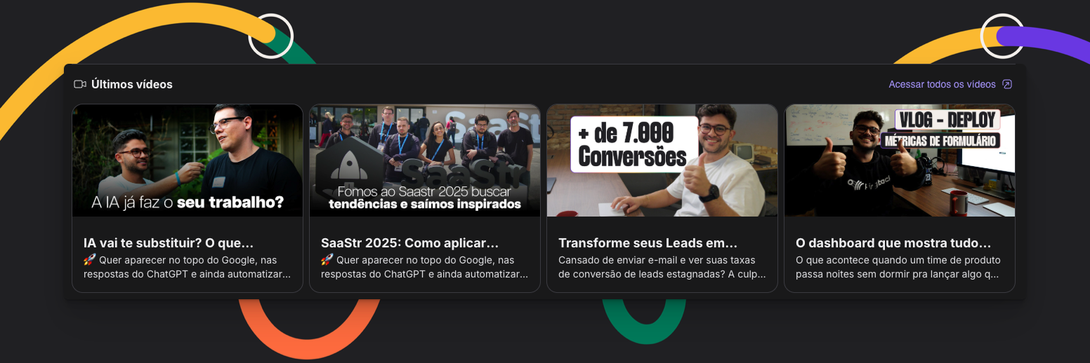 Últimos vídeos: Acompanhe o que estamos publicando no YouTube direto da plataforma. Tutoriais, vlogs de produto, cases - tudo em um só lugar.