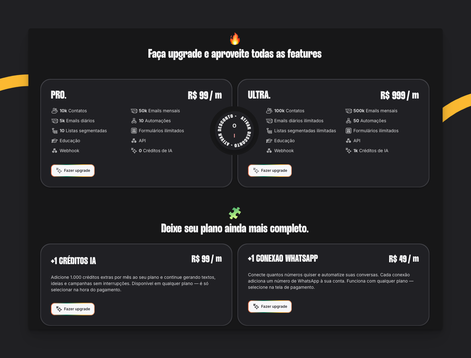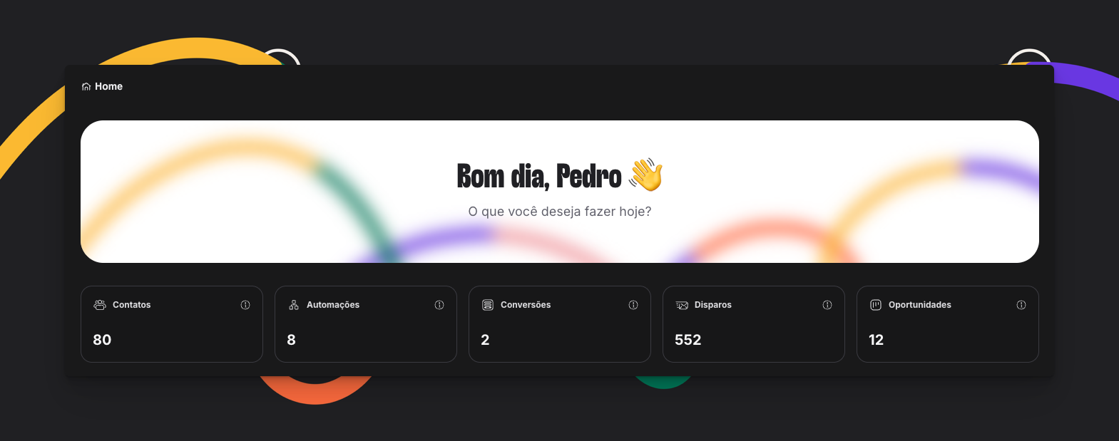 Planos e addons: Veja seu plano atual, addons contratados e opções de upgrade diretamente da Home. Sem precisar procurar em configurações.