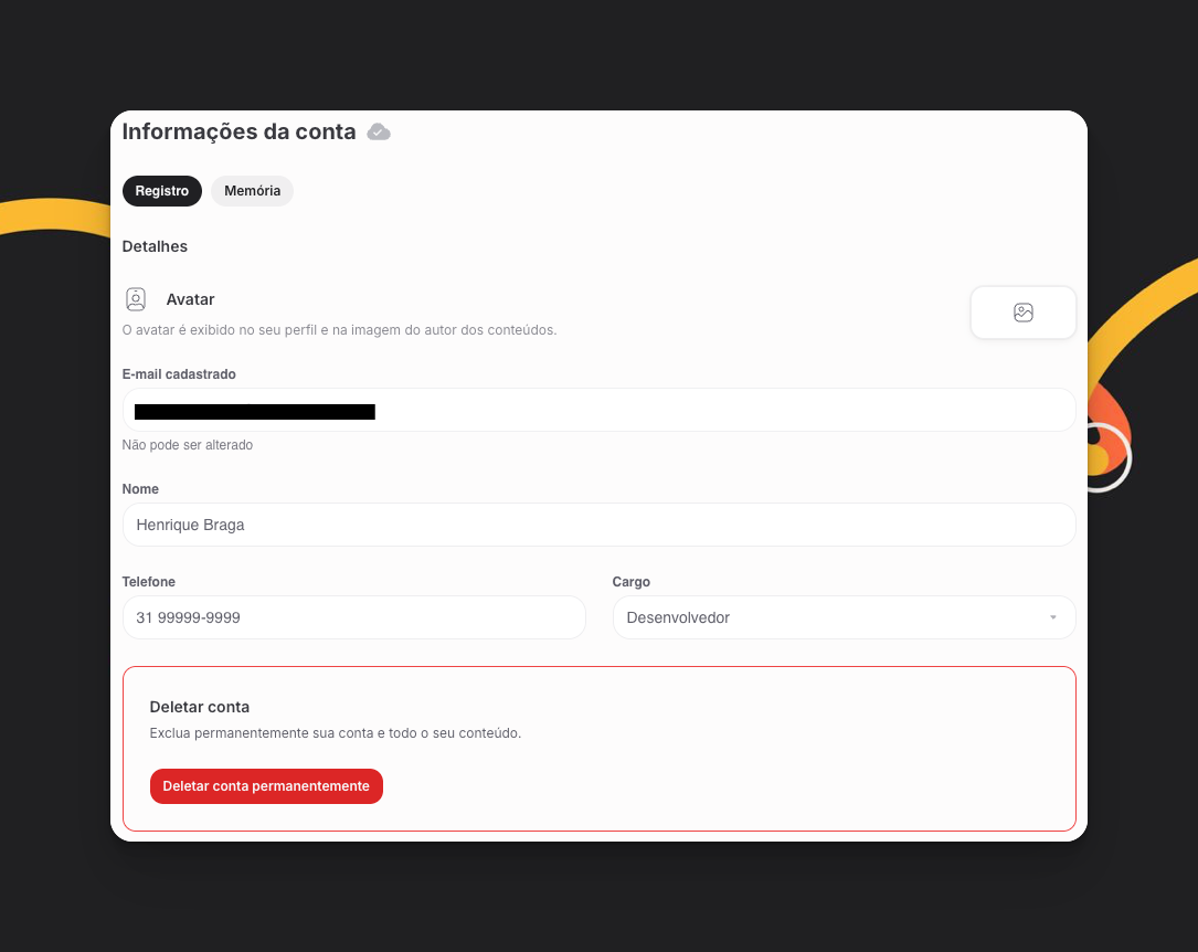Esses dados podem ser preenchidos logo após a criação de uma nova conta ou acessando diretamente o menu Informações da conta → Memória: