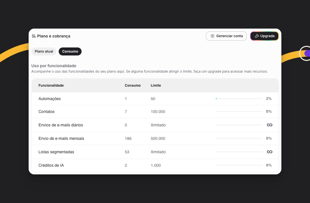 Nessa tela, o usuário encontra uma tabela completa com todos os limites do seu plano e o quanto já foi utilizado em cada funcionalidade.