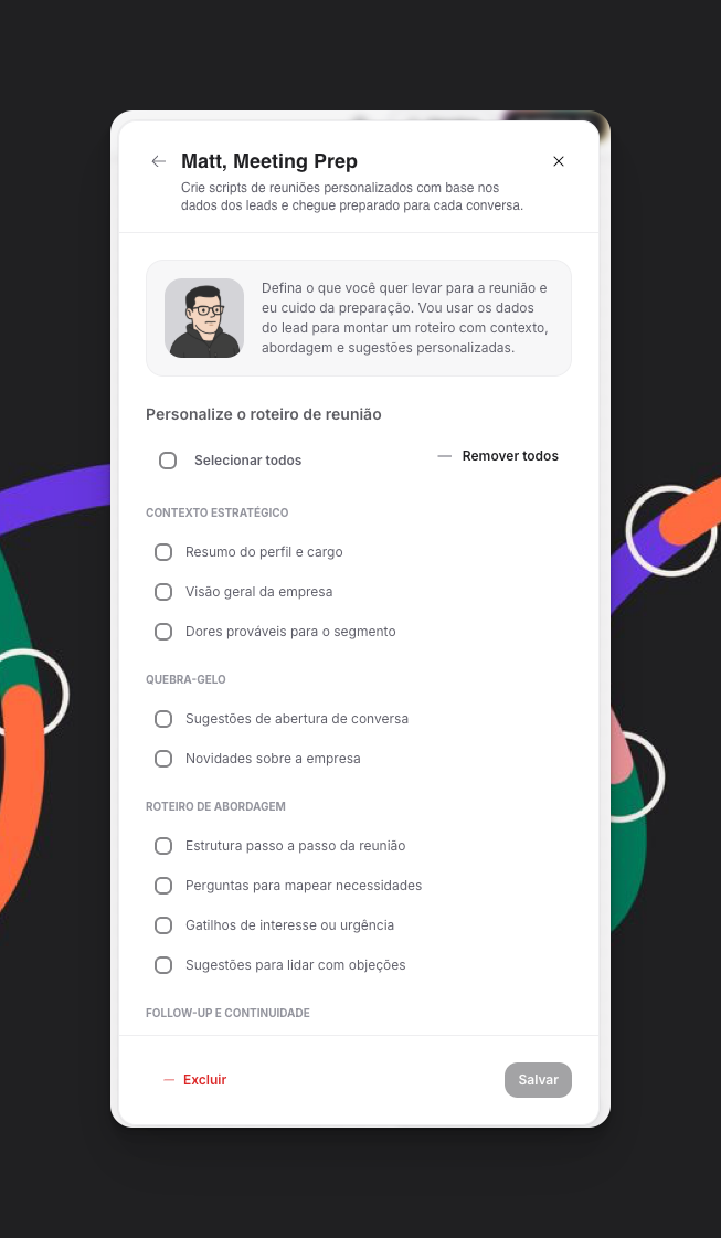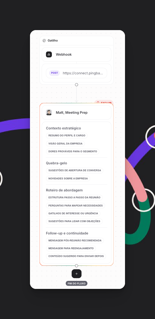 Gatilho: Lead scoring > 80 pontos →Ação: Matt (contexto + quebra-gelo + discovery) →Ação: Notificar vendedor para contato
