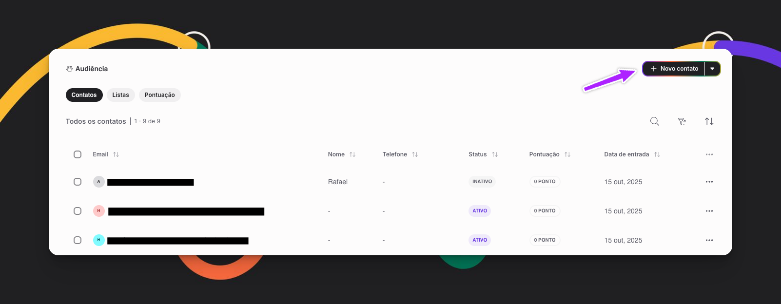 Para adicionar um contato individual, clique no botão "Novo contato" no canto superior direito da sua lista de contatos.