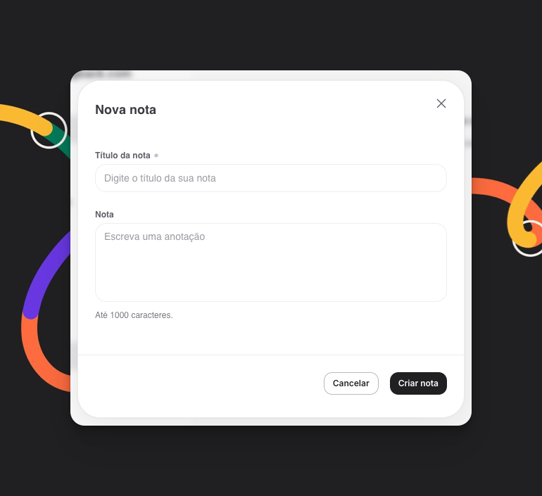 Clique em "Criar Nota" para abrir o editor. Cada nota possui: