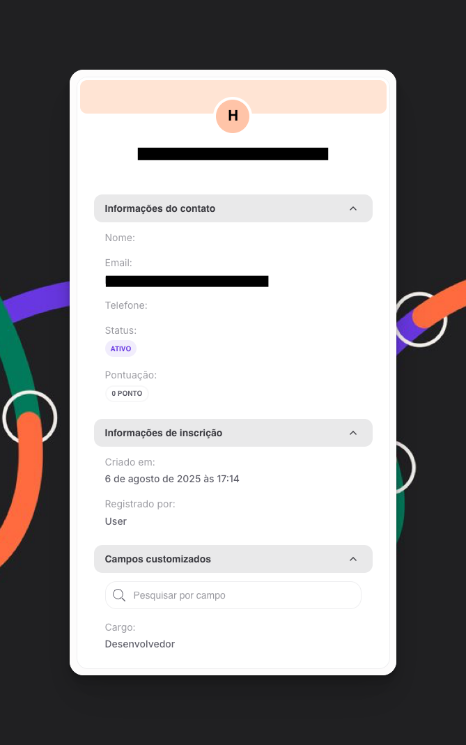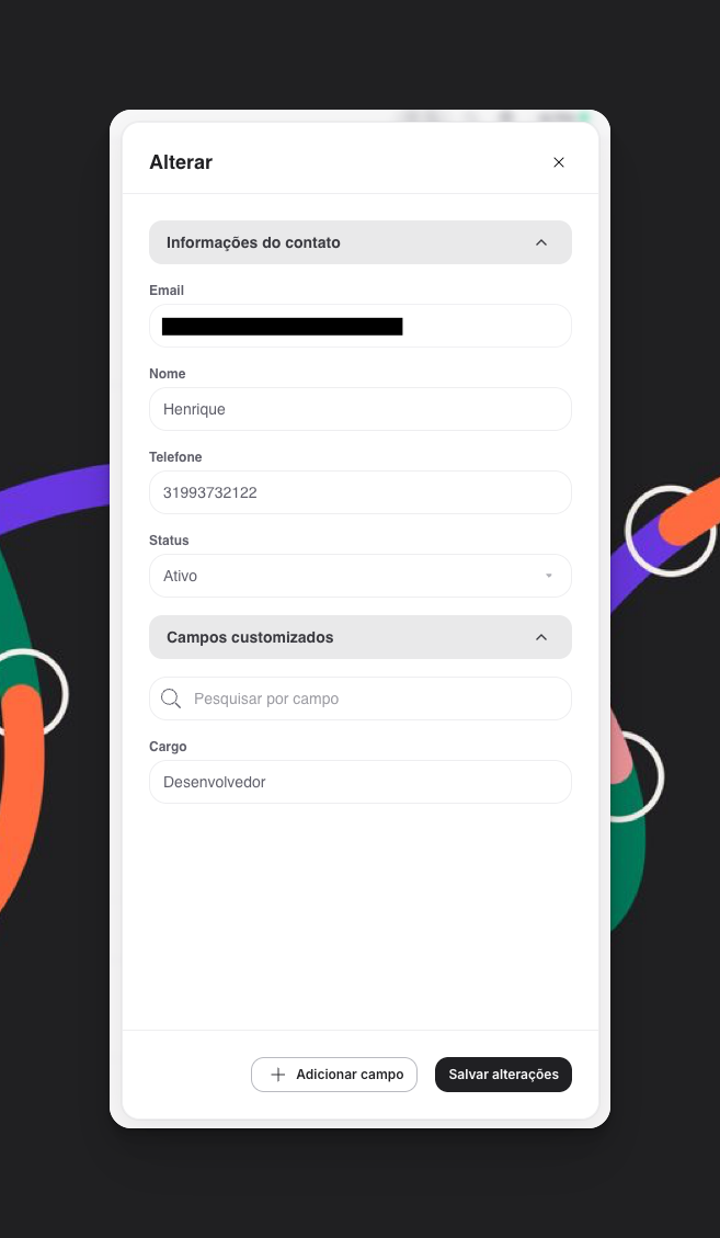 Campos customizados: Todos os campos personalizados que você criou aparecem aqui, permitindo armazenar informações específicas do seu negócio como cargo, empresa, interesses, ou qualquer dado relevante para sua estratégia.