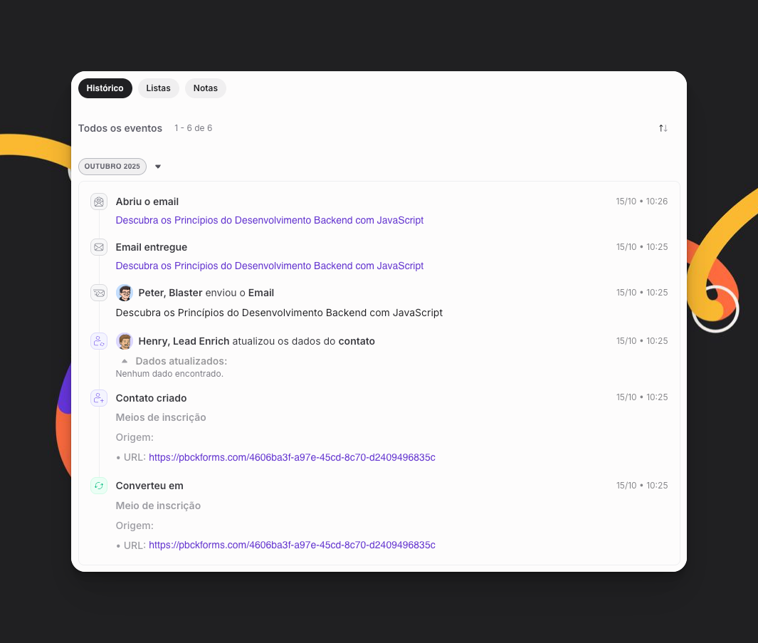 Use o histórico para identificar padrões de comportamento dos seus melhores leads. Se você notar que leads que abrem emails específicos tendem a converter mais, pode criar automações baseadas nesses insights. Com times pequenos, essa inteligência de dados é seu diferencial competitivo.