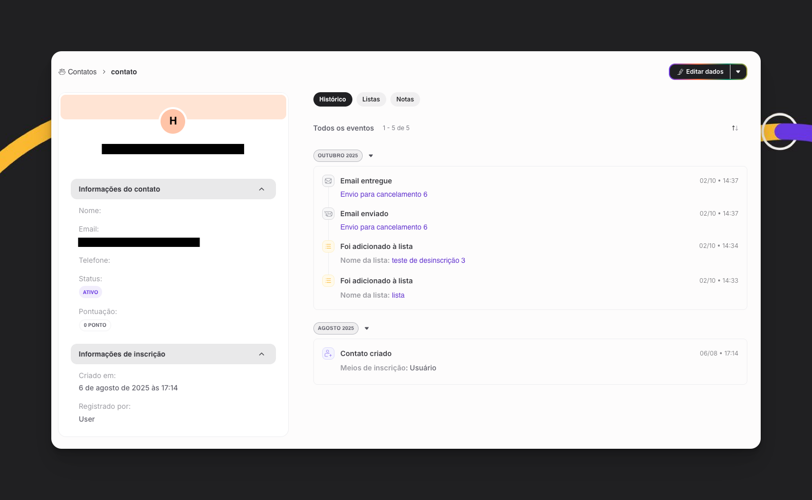 Aba Listas: Veja todas as listas segmentadas que este contato faz parte