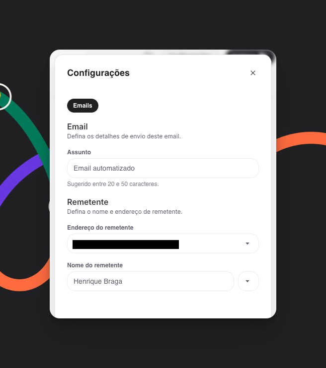 Clique em 'Configurações' no editor e escolha o remetente que será utilizado para enviar o email.