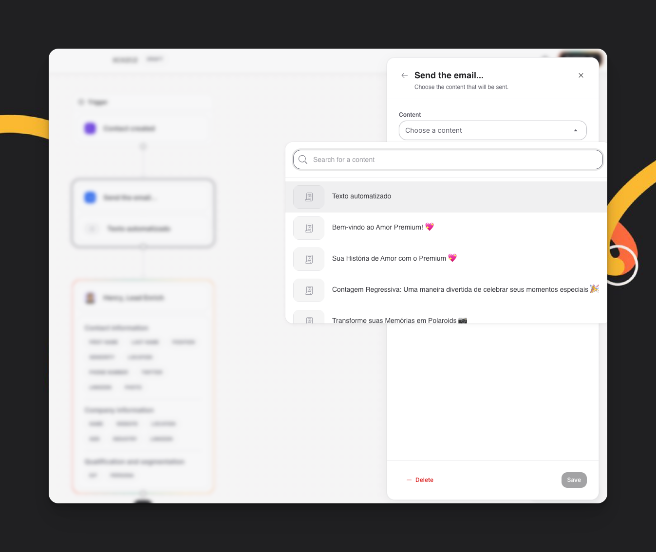 Na ação "Enviar email", selecione seu conteúdo