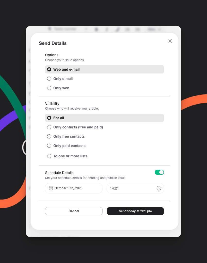 Configuração diferente para web: Opção para agendar publicação web separadamente do email