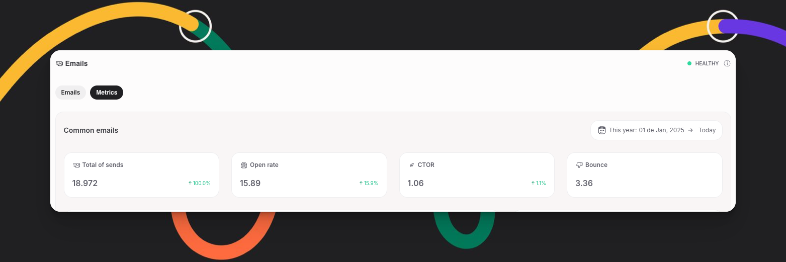 As principais métricas de desempenho dos emails enviados são apresentadas logo no início: