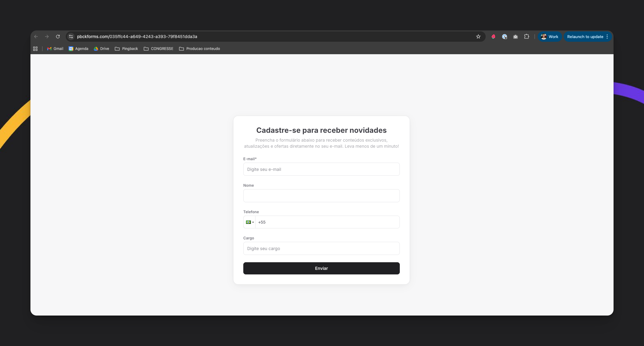 É um endereço público gerado pela Pingback, que exibe o formulário de forma independente, pronto para ser preenchido por seus contatos.