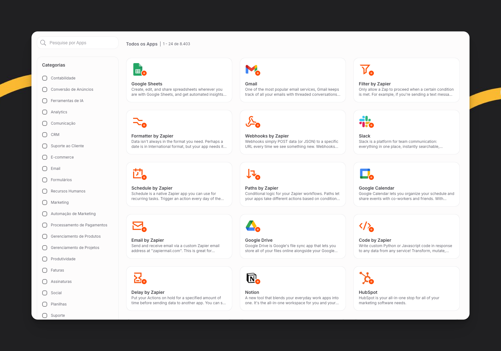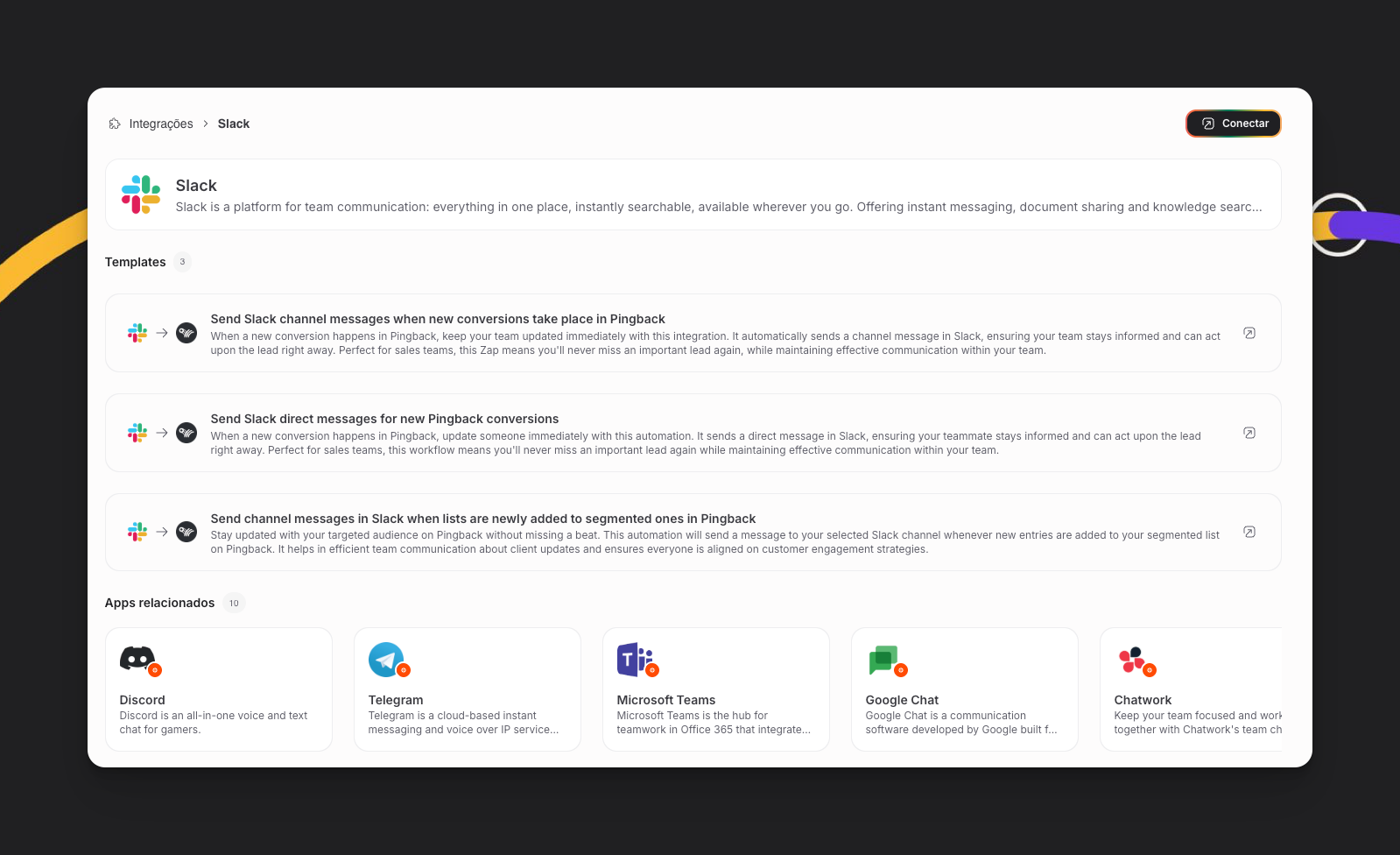 A Pingback oferece integração com mais de 8.200 aplicativos através da plataforma Zapier, cobrindo praticamente todas as ferramentas que você já usa.