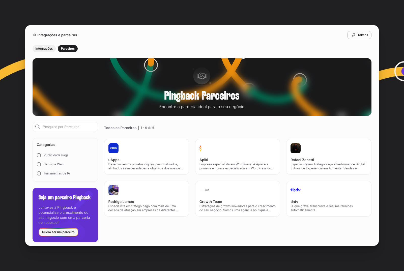Além de integrações técnicas, a Pingback mantém uma rede curada de parceiros especializados para quando você precisa de suporte profissional.